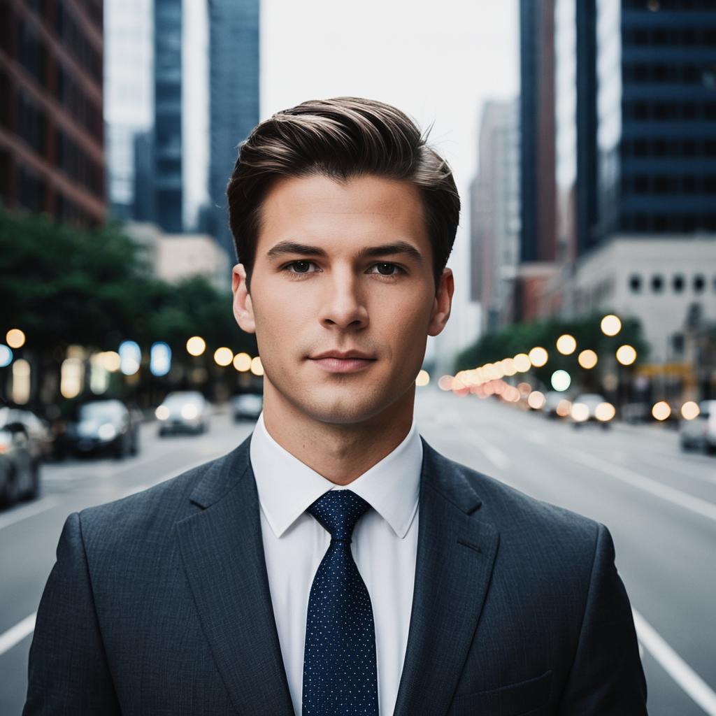 Outfit party night man, photorealistic, male model, standing in urban street at night, blurred city lights in background, wearing light gray suit, white dress shirt, blue patterned tie, navy pocket square, short brown hair, clean shaven, serious expression, hands in pockets, medium build, stylish, handsome, evening light, cityscape, fashion photography, high quality