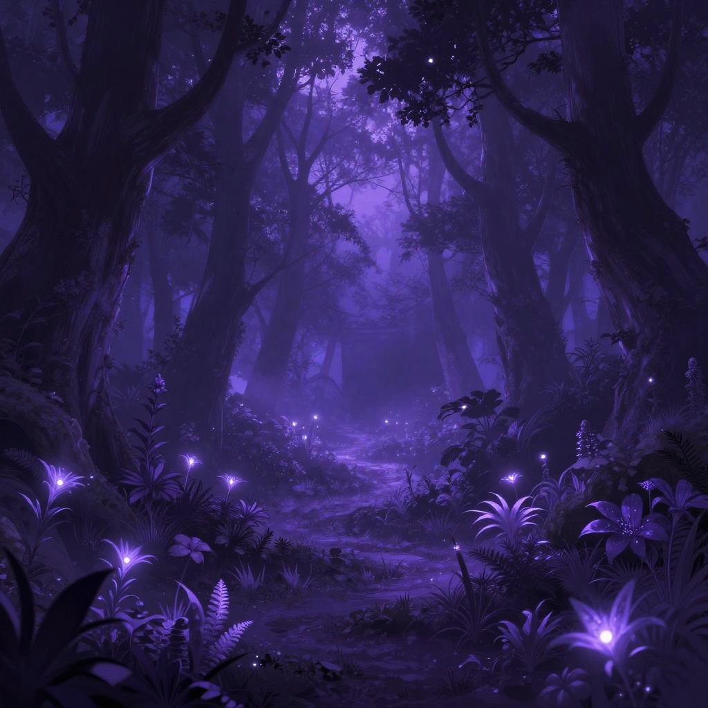 Mysterious, purple-lit forest scene with glowing fireflies, dark silhouetted trees, and vibrant bioluminescent plants on a mist