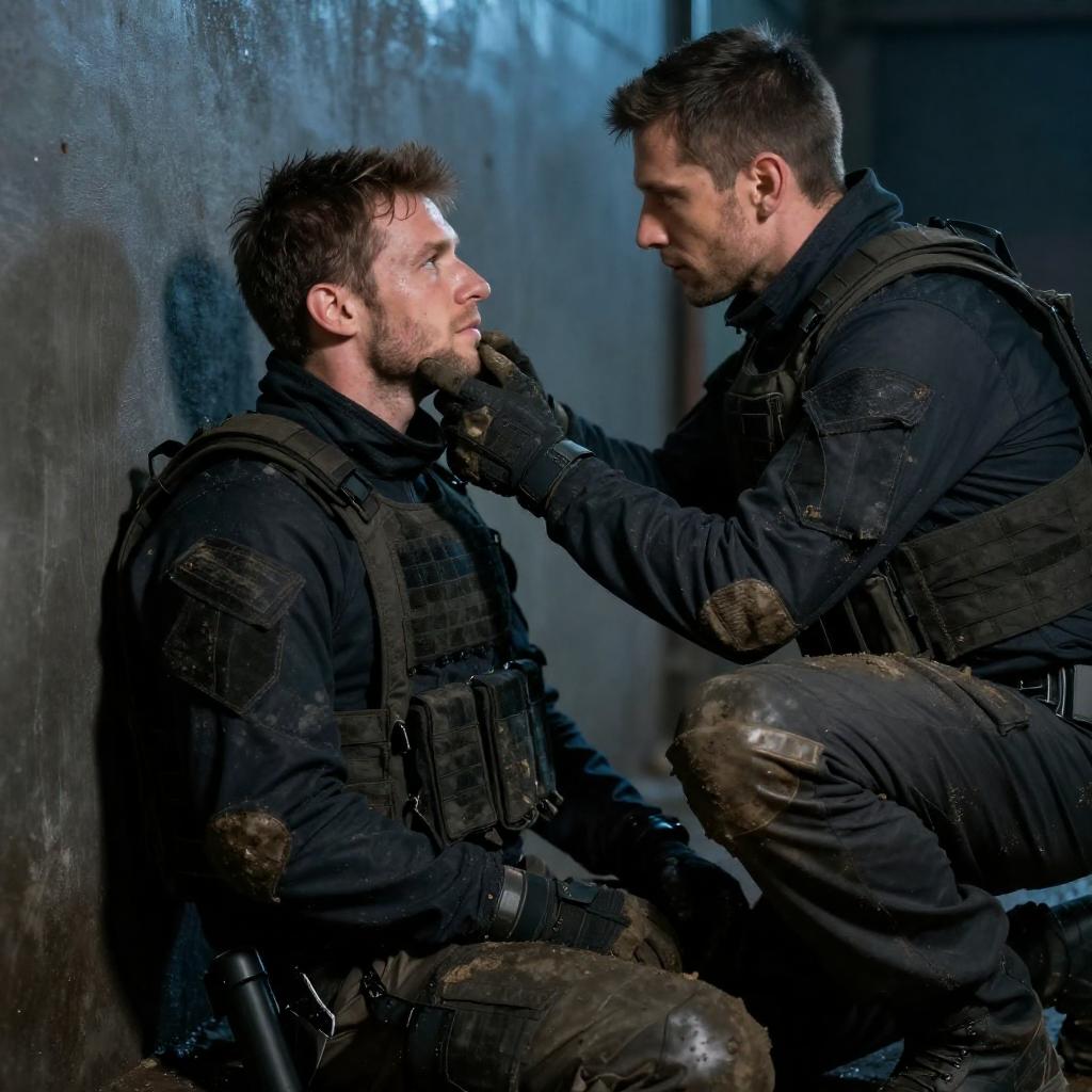 Photograph of two muddy, rugged men in dark tactical gear, illuminated by blue light. One man, with short brown hair, sits against a wall, looking up at the other, who is kneeling, gripping the seated man's face with a gloved hand. The background is dim and industrial.