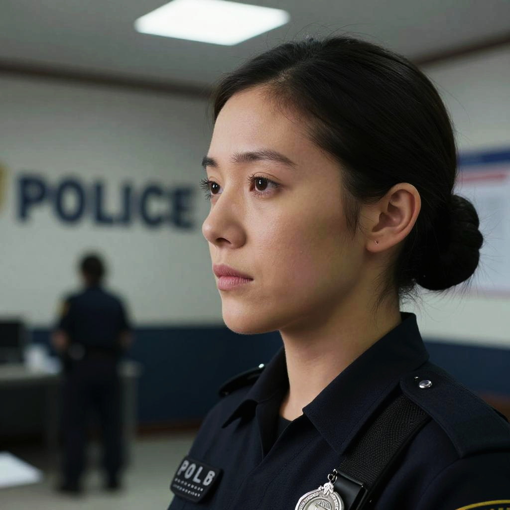 Photograph of an Asian female police officer with dark hair in a bun, wearing a black uniform, standing in a police station with blurred background and "