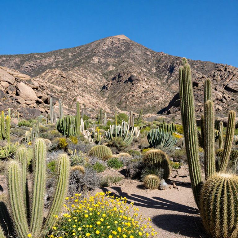 Photograph of a desert landscape featuring tall, green cacti, yellow wildflowers, and a rocky mountain under a clear blue sky.
