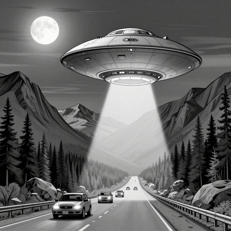 The image depicts a surreal scene set on an Alaskan highway, with a large, hovering UFO casting a beam of light onto the landscape. The UFO, characterized by its circular shape and prominent central opening, hovers above the highway, creating an otherworldly atmosphere. The highway, lined with evergreen trees and rocky outcrops, stretches into the distance, flanked by towering mountains that rise majestically against the night sky. The moon, a bright, luminous orb, hangs in the upper left corner, casting a soft glow over the scene. In the foreground, several cars are driving along the highway, their headlights cutting through the darkness. The overall composition is detailed and meticulously drawn, with a focus on the interplay of light and shadow, creating a sense of depth and realism. The image is designed for coloring, with clean lines and a monochromatic color scheme that allows for easy coloring while maintaining the intricate details of the scene.