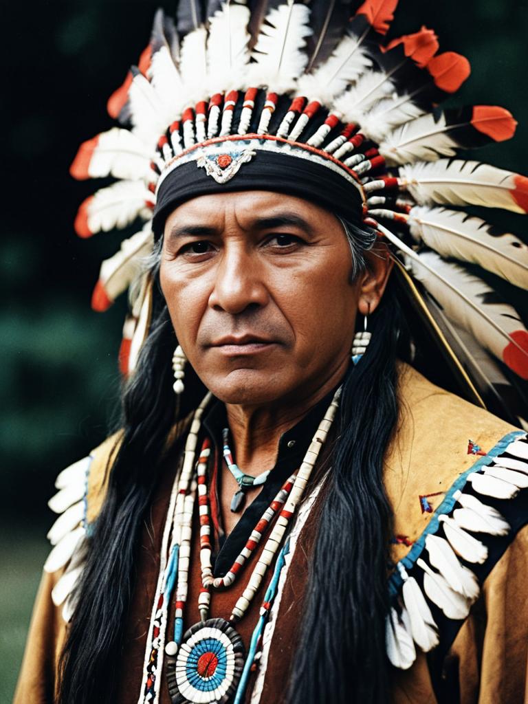 Man in American Indian costume, cinematic realism, sharp professional portrait