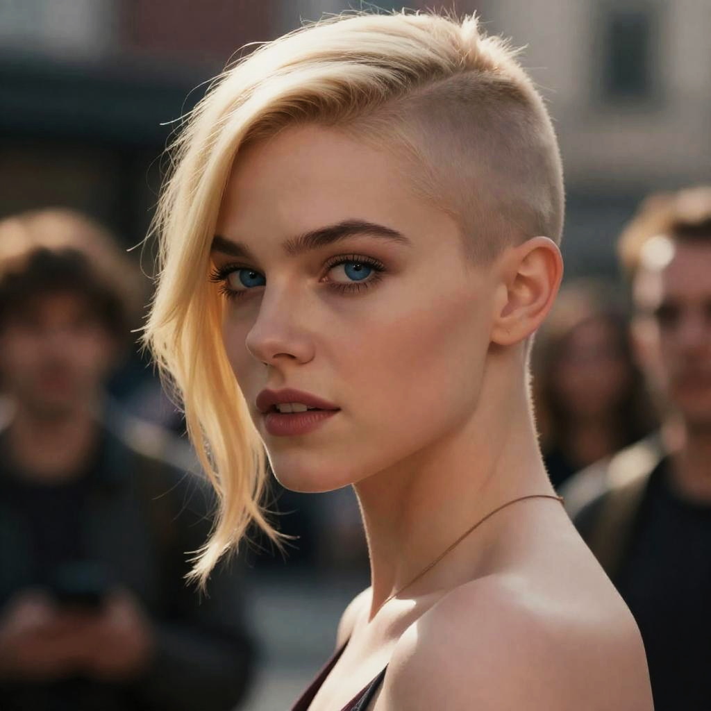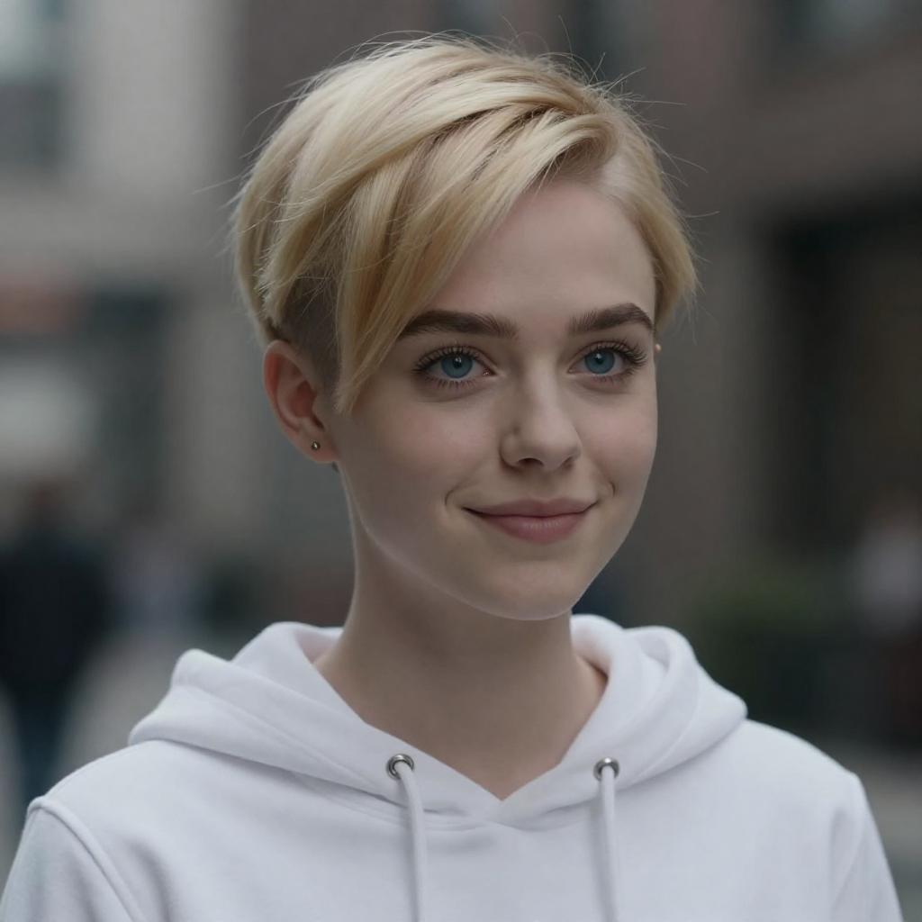 ((realistic)), (cinematic lighting), (photorealism), (beautiful detailed face), ((masterpiece)), ((best quality)), side of head shaved, depth_of_field, (beautiful detailed eyes), (gwen_stacy), 1girl, blonde_hair, short_hair, (asymmetrical_hair), ((sidecut)), solo, upper_body, portrait, blue_eyes, light_smile, parted_lips, lips, city, eyebrow_piercing, hood, hood_down, white_hoodie, looking_at_viewer