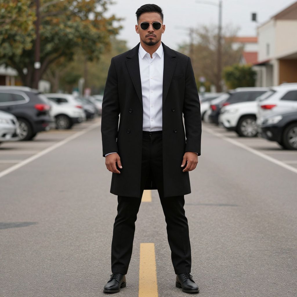 Stylish Clothes Over Costume, man in a black coat and white shirt standing in a parking lot