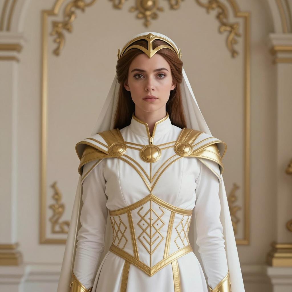 Princess amidala cosplay, photorealistic, female character, Star Wars cosplay, realistic style, medium shot, frontal view, woman with brown hair in elaborate buns, wearing red and gold dress with shoulder cape, detailed jewelry, blue and red gemstone chest piece, gold arm cuffs, fair skin, serious expression, background with blurred ancient columns and greenery, daylight, soft lighting, symmetrical composition, fantasy, sci-fi, elegant, regal, intricate costume design