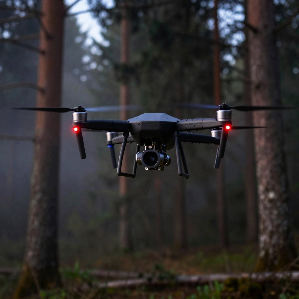 Drone with red and blue lights flying through a dense forest at dusk, illuminating the surrounding trees and mist, intricate mechanical details, cinematic lighting