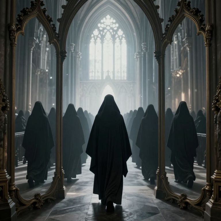 A photograph of a dimly lit, Gothic cathedral interior featuring a central figure in a black, hooded robe, walking towards a bright, arched window. The figure's back is to the camera, surrounded by multiple ornate, golden-framed mirrors reflecting the same scene. The mirrors create a symmetrical, almost mystical effect. The cathedral's high, vaulted ceiling and stone pillars are visible in the background, adding to the grandeur and solemnity of the setting. Soft light filters through the window, casting a subtle glow on the stone floor. The overall mood is mysterious and contemplative.