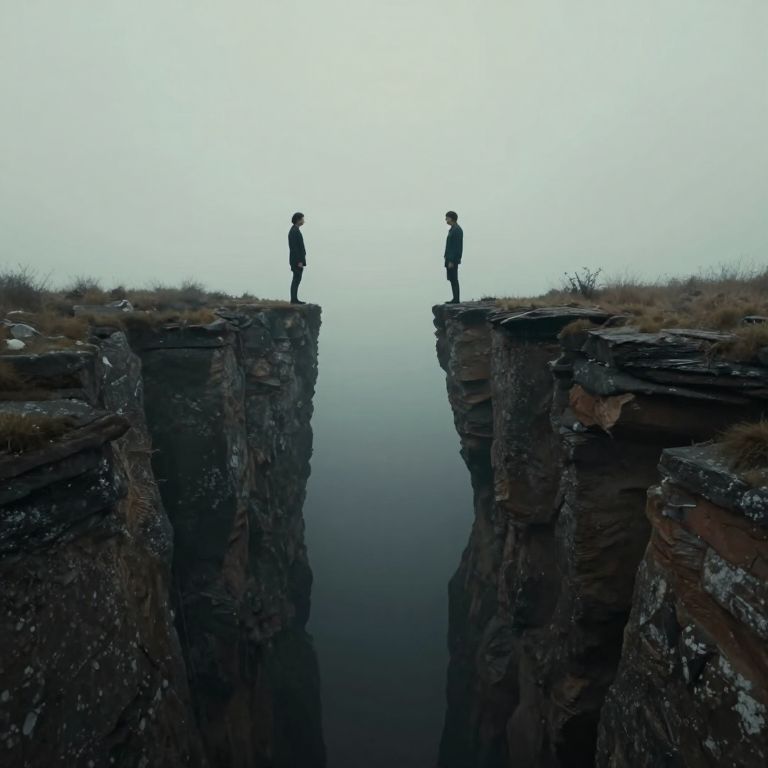 Photograph of two silhouetted figures standing on opposite rocky cliffs, facing each other over a calm, dark chasm in a foggy,