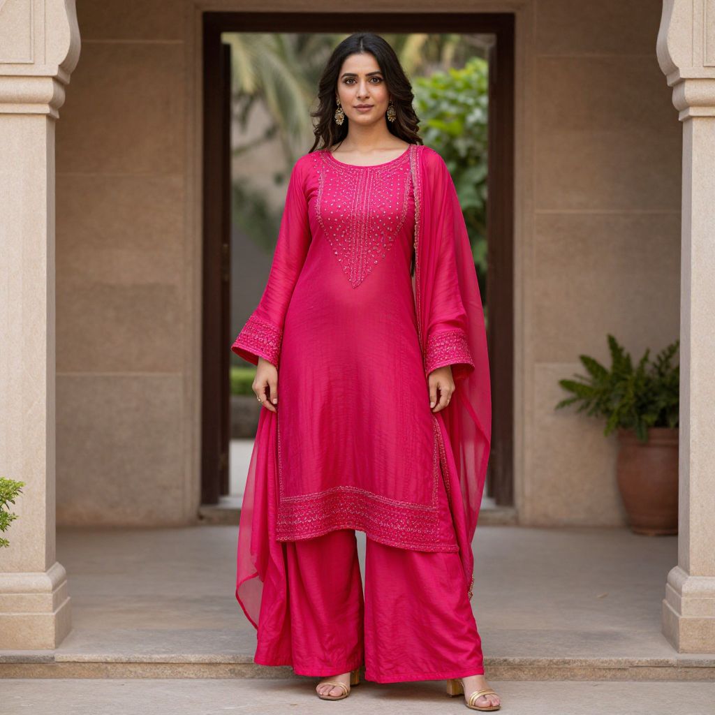 Woman wearing a vibrant Chanderi bright pink embellished bell sleeves kurta paired with wide flared palazzo pants and a matching sheer dupatta, standing gracefully in front of an arched doorway surrounded by stone pillars and greenery.