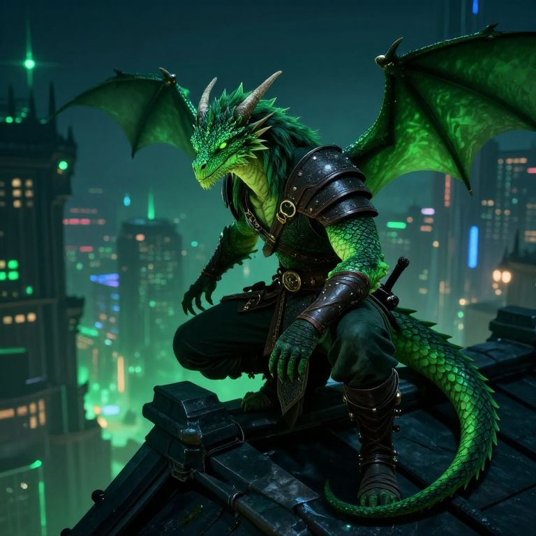 Green dragonborn art illustrating an agile dragonborn rogue with sleek green scales and leather armor, perched on a rooftop overlooking a bustling fantasy city at night, neon green accents highlight stealth and agility, atmospheric cyber-fantasy setting