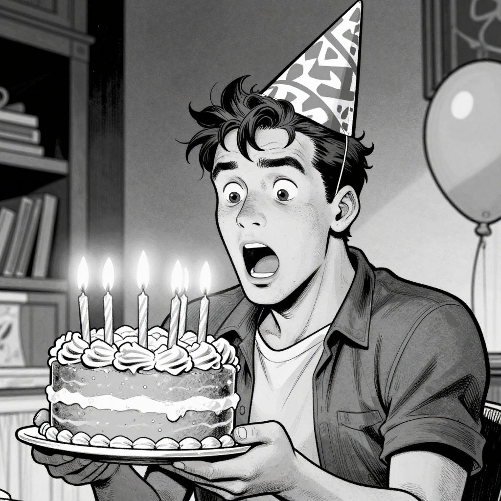 A surprised man wearing a patterned party hat holds a birthday cake with lit candles, captured in a detailed black and white comic book style artwork. The grayscale illustration highlights expressive facial features and shading, emphasizing the celebratory and dramatic mood of the scene.