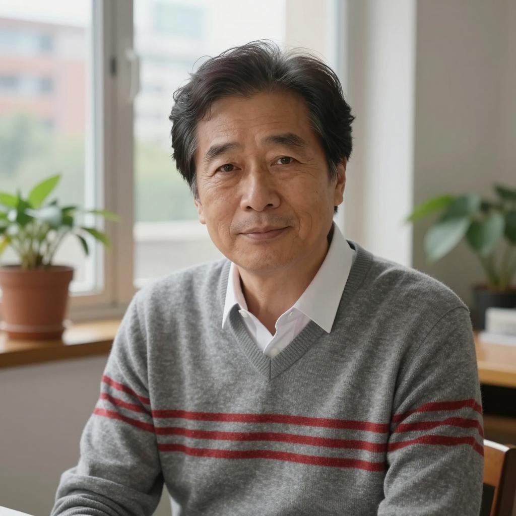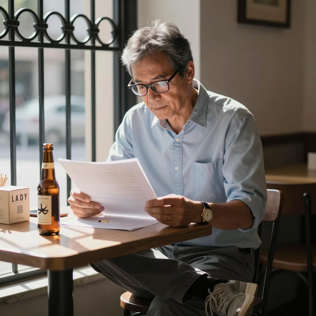 Middle-aged man with glasses, light blue shirt, and gray sneakers, sitting at a table, holding a card, reading a paper, bottle of beer, box labeled "LADY". Black wrought iron gate, sunlight, window in background. Man has focused expression. Table has other items.