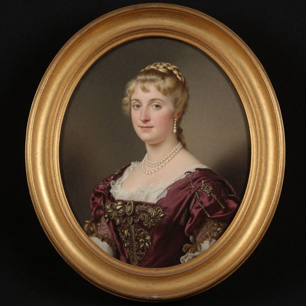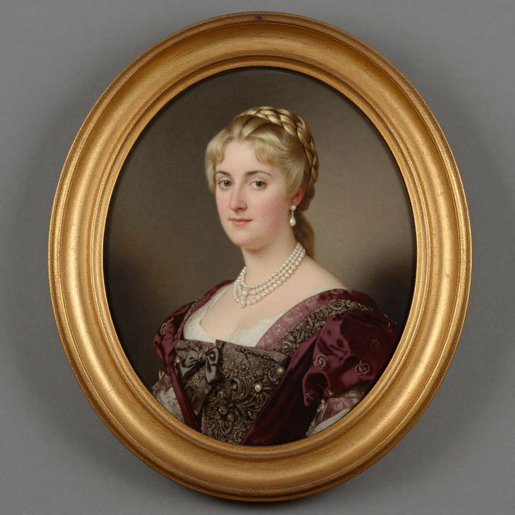 Portrait of a 19th-century aristocratic woman with blonde hair, wearing a maroon gown with gold embroidery, white lace, and pearl necklace,
