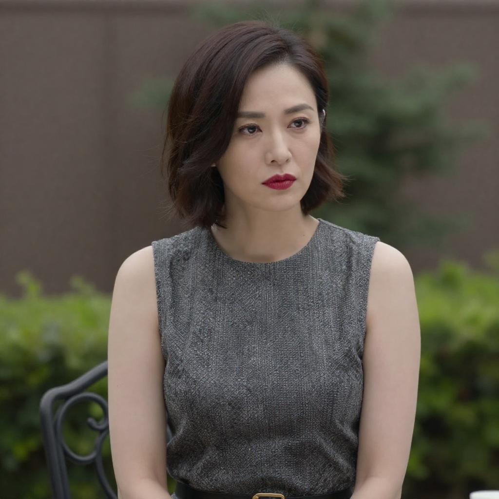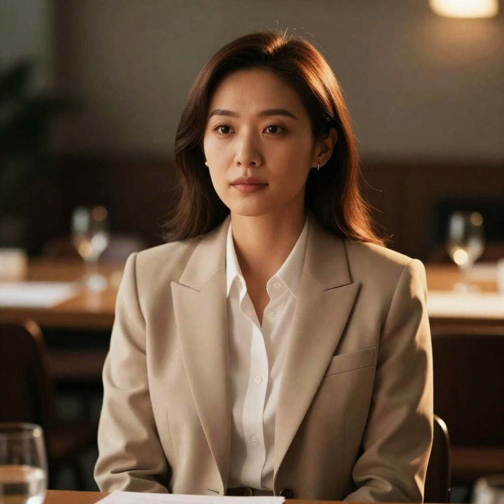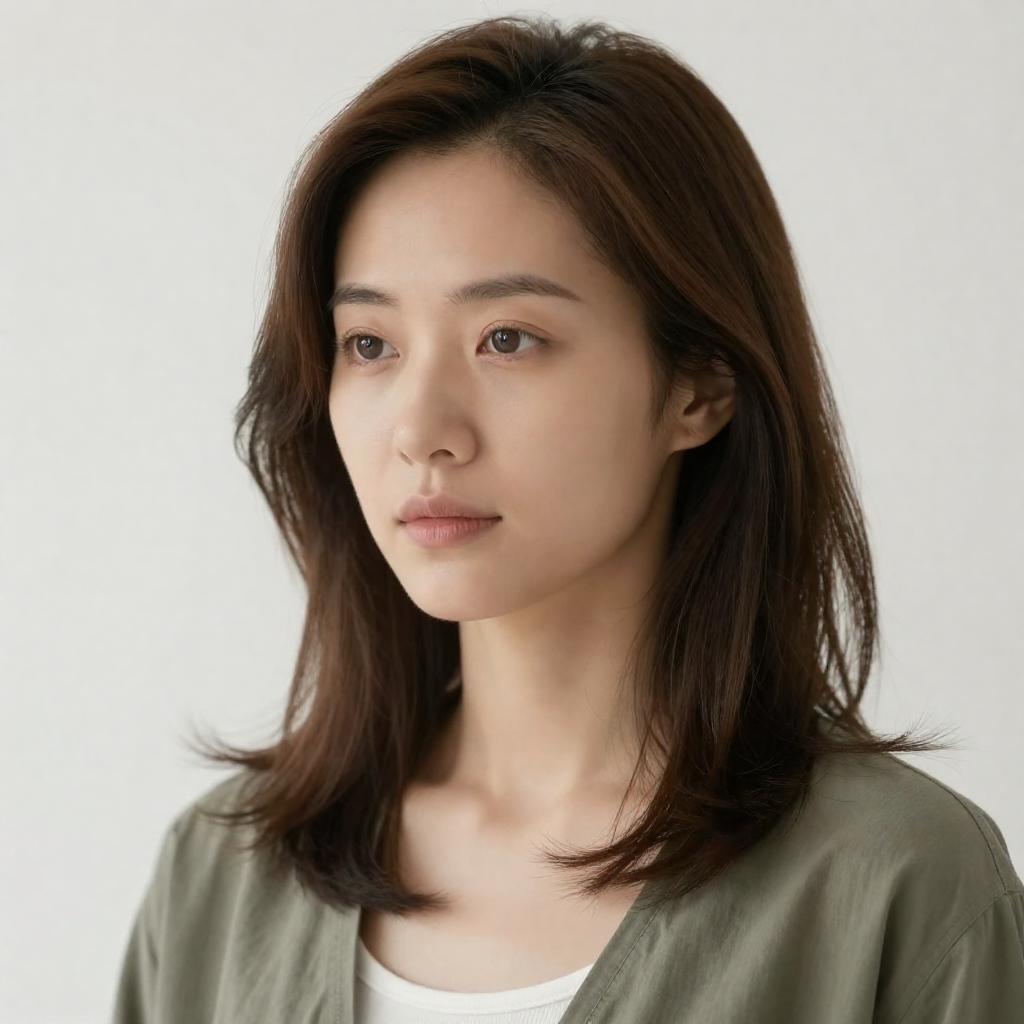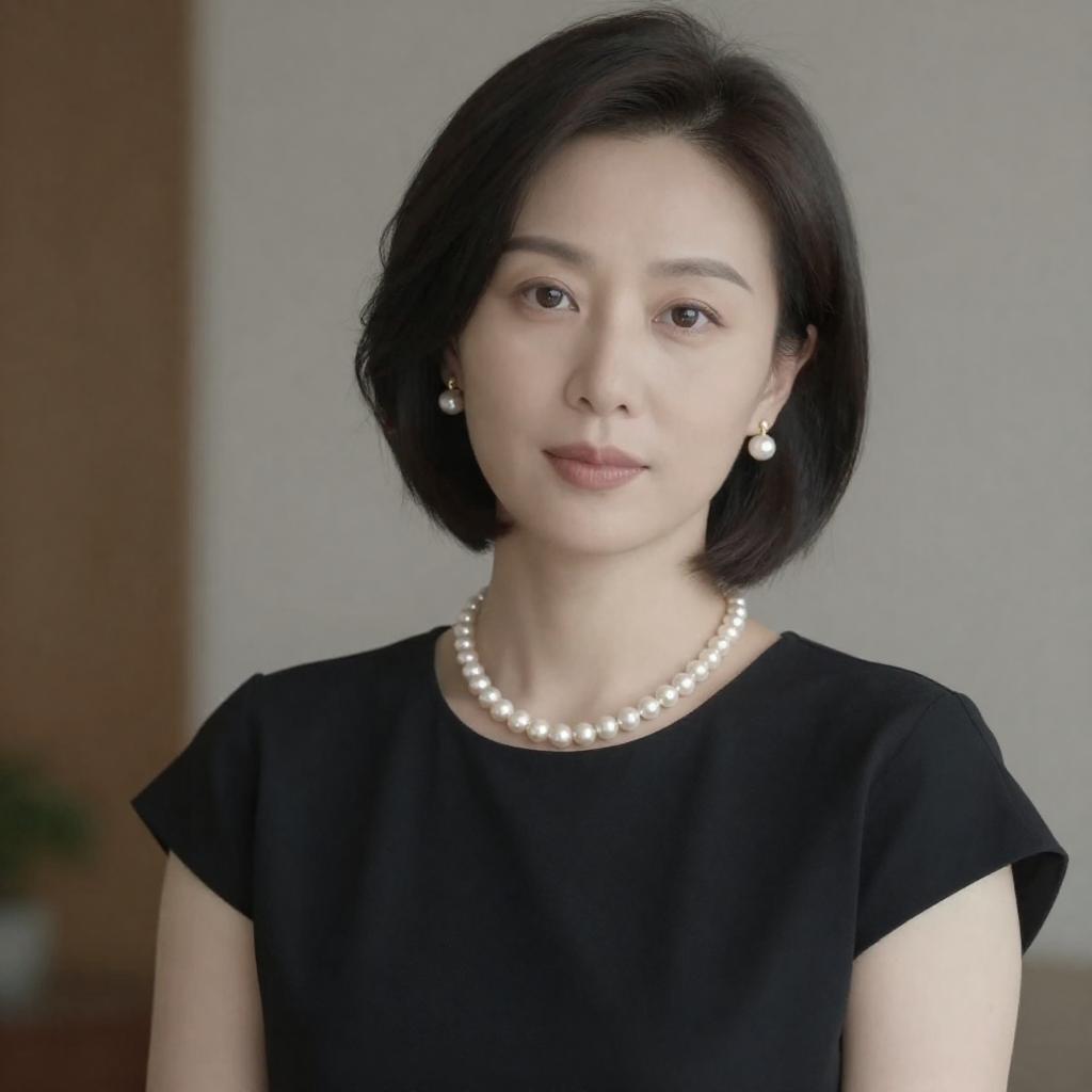 Photograph of a young woman with short, wavy brown hair, wearing a dark, patterned blouse and a long pearl necklace. She stands in profile against a bright, blurred outdoor background, looking slightly to the right with a calm expression.