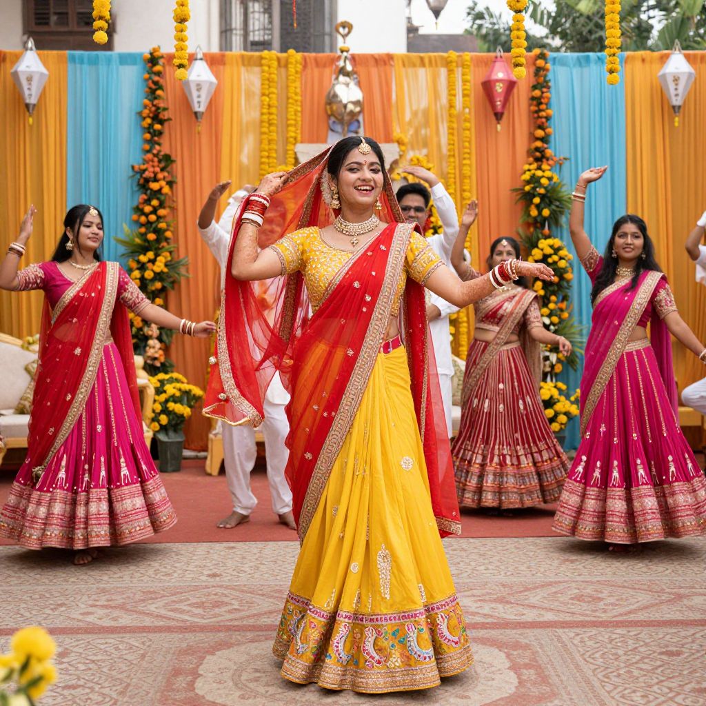 Photograph of Indian women in vibrant red and yellow traditional sarees, dancing joyfully in a decorated outdoor setting with yellow flowers and blue-orange curtains.