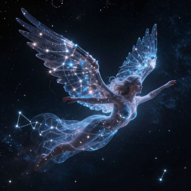 Digital artwork of a glowing, ethereal angel with blue, starlit wings and translucent dress, soaring through a starry night sky.