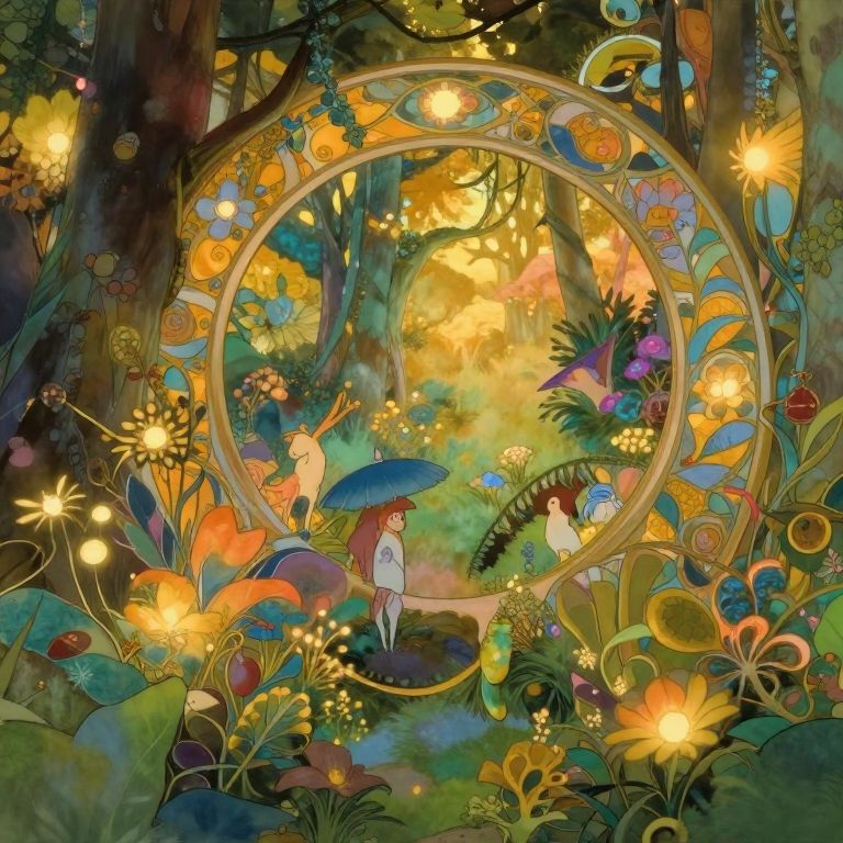 Craft an image that embodies the enchanting essence of Art Nouveau, harmoniously merging with the ethereal beauty of Studio Ghibli landscapes. Depict a panoramic view from a 'bug's-eye perspective', showcasing a mystical forest adorned with intricate, glowing flora and fauna, gently bathed in soft golden light. The scene should evoke an atmosphere that is both magical and serene, creating an emotional gradient that effortlessly transports viewers into a realm where nature and fantasy seamlessly intertwine.