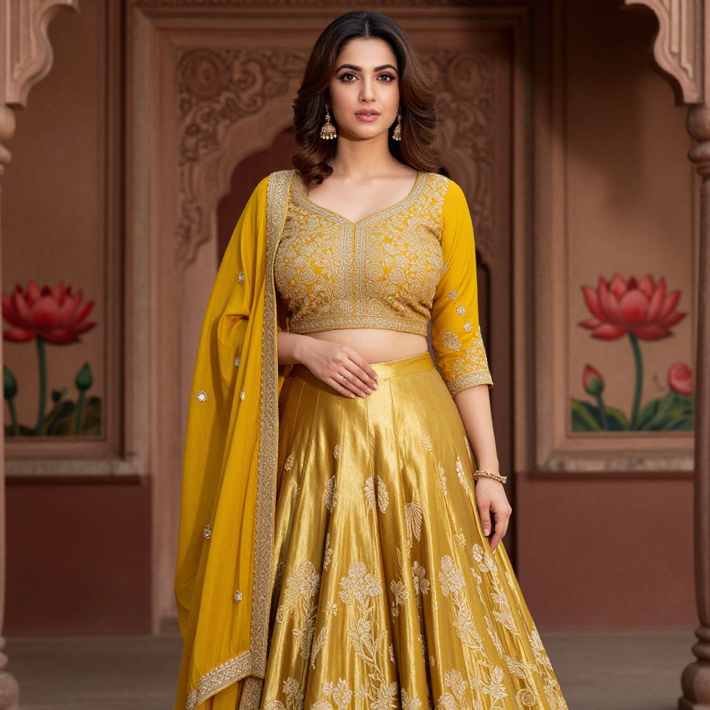 Indian woman with medium brown skin and dark wavy hair, wearing a gold embroidered crop top and skirt, yellow dupatta, standing in an ornately