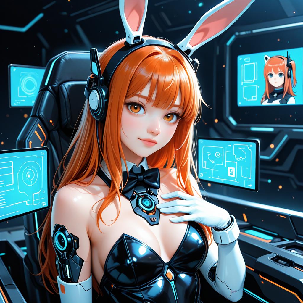 Digital illustration of a futuristic female android with mechanical arms and an exposed robotic torso wearing a black bunny suit and white gloves. The character has orange hair and large white bunny ears, with orange glowing eyes, set against a high-tech, sci-fi control panel background.