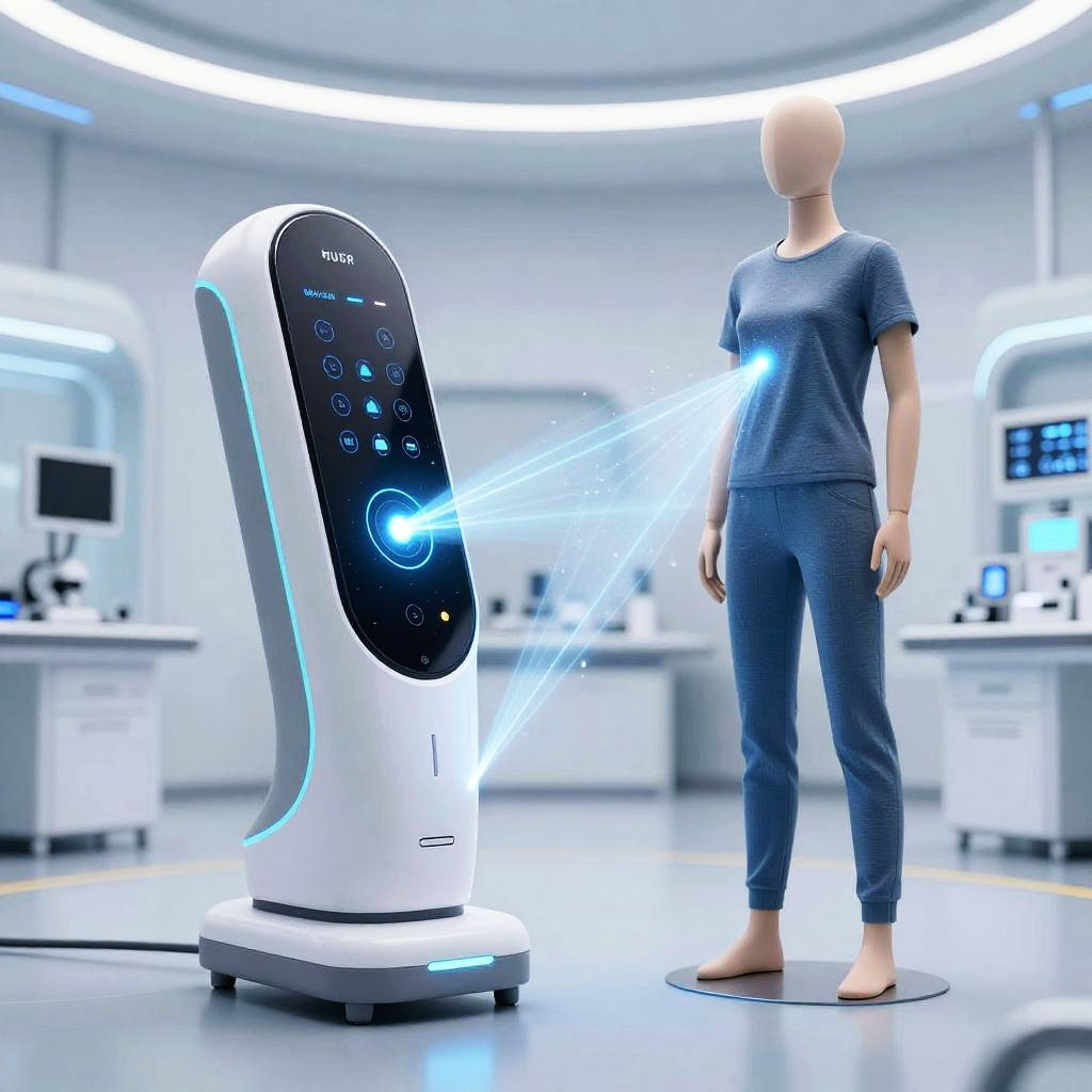 Futuristic AI clothes remover tool, sleek gadget emitting laser beams selectively removing clothes from a figure, set in a clean high-tech lab environment, blue and white tones, sparkling light effects, advanced AI technology concept art, hyper-realistic style