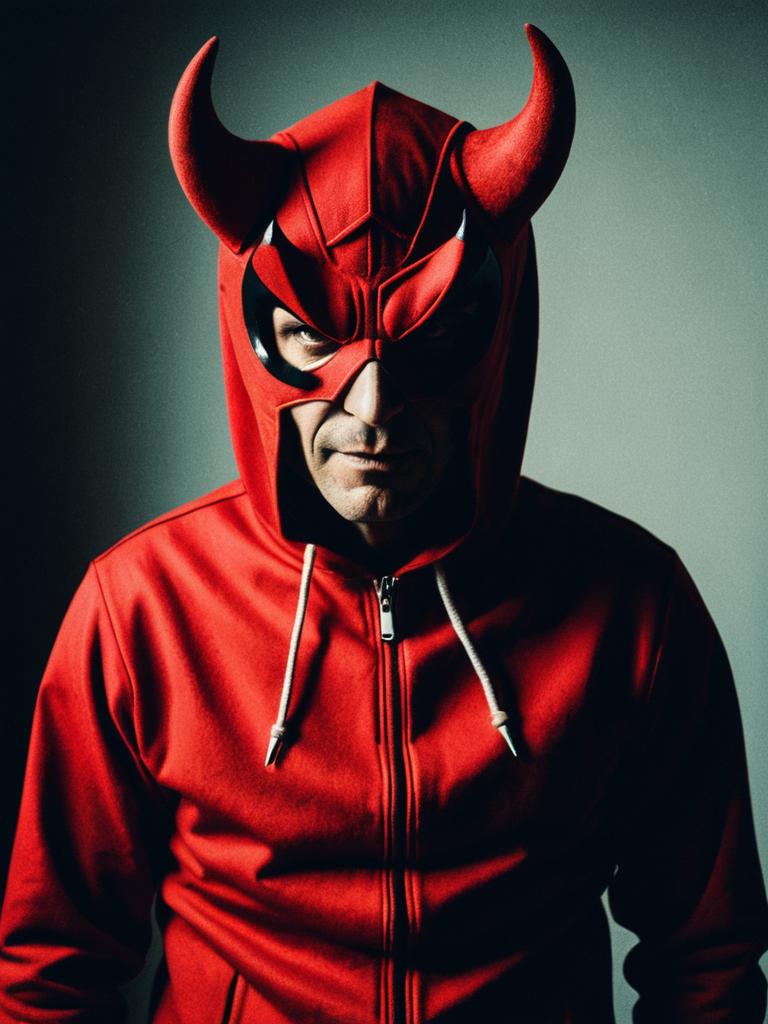 Man in Red Devil Costume, waist-up editorial portrait, photorealistic tones