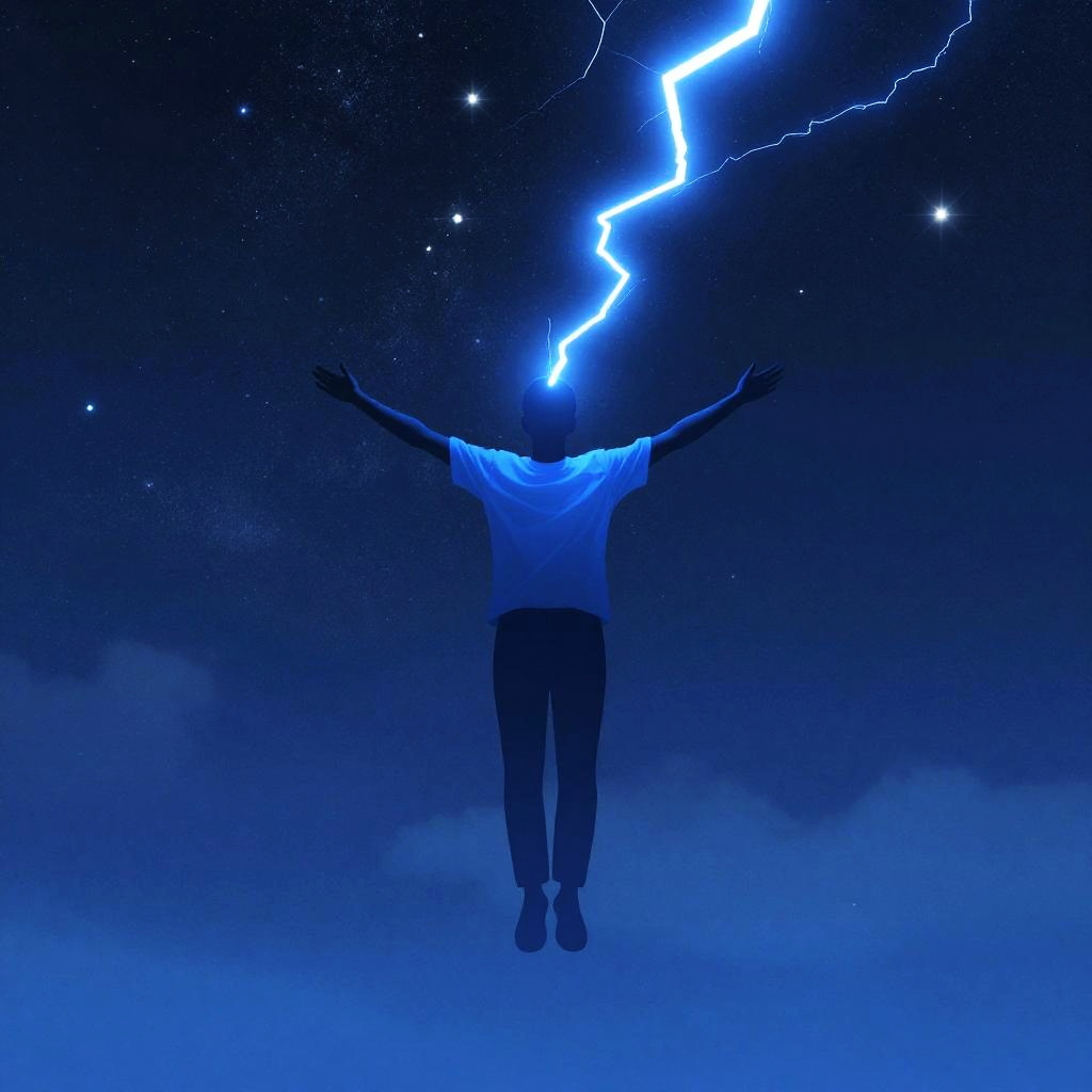 Digital art of a person with outstretched arms, floating in a starry night sky. The figure is silhouetted in bright blue, with dark blue pants and a light blue shirt. A vivid blue lightning bolt shoots from their head, illuminating the surrounding stars and clouds. The background gradients from dark to light blue, creating a dreamy, celestial atmosphere.
