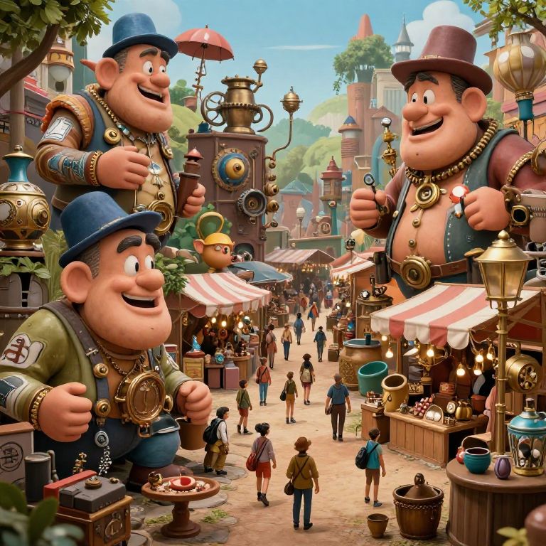 This vibrant, digital CGI illustration depicts a bustling, steampunk-style marketplace. Three large, jovial, cartoonish men with round faces, blue hats, and colorful vests, resembling steam-powered automatons, stand at market stalls. They each hold steaming teapots and cups. The market is filled with various wooden stalls, adorned with red and white striped awnings, selling copper pots, teapots, and other steampunk-inspired items. Small human figures, dressed in period clothing, walk through the cobblestone street. The background features whimsical, towering buildings with greenery and a clear blue sky. The overall style is colorful, playful, and richly detailed.