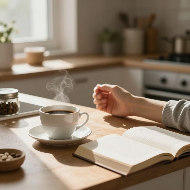 Abitudini theme depicting morning rituals, a cozy kitchen with sunlight streaming in, cups of coffee, open books, and a person stretching, warm tones, calm and peaceful mood, realistic style with soft focus, emphasizing the comfort of daily habits and serenity