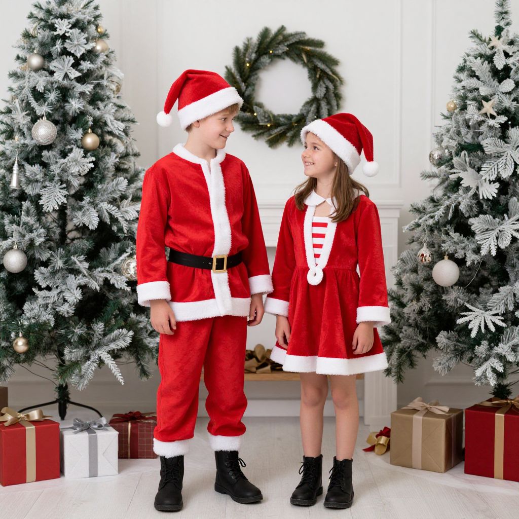 Matching Christmas Outfit Siblings Costume, couple dressed in santa claus costume standing in front of decorated christmas trees