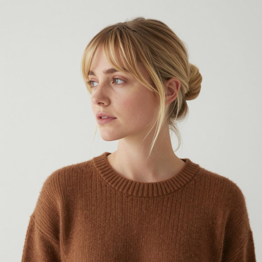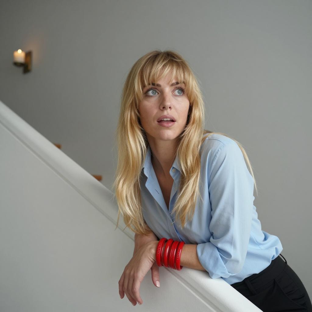 Woman with long blonde hair, bangs, and light blue blouse leans on white railing, wide-eyed, mouth slightly open. Gray wall background, stairway to the left, red bangles on her right wrist. Candle on left wall.