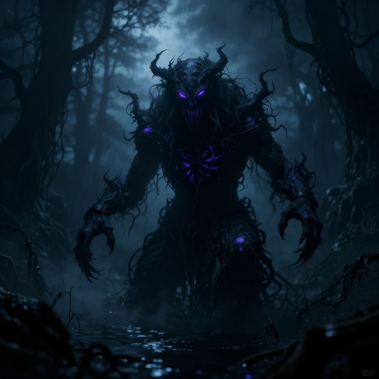 Digital artwork of a dark, menacing creature standing in a misty, blue-lit forest. The creature has a twisted, organic appearance with black, tangled tendrils and horns, and glowing purple eyes. Its silhouette is mostly shadowy, with visible sharp claws on its hands. The background features blurred, tall trees with a foggy atmosphere, creating an eerie, otherworldly setting. The creature's figure is centered, emerging from a reflective, shallow water pool that mirrors its ominous presence. The overall mood is dark and foreboding.