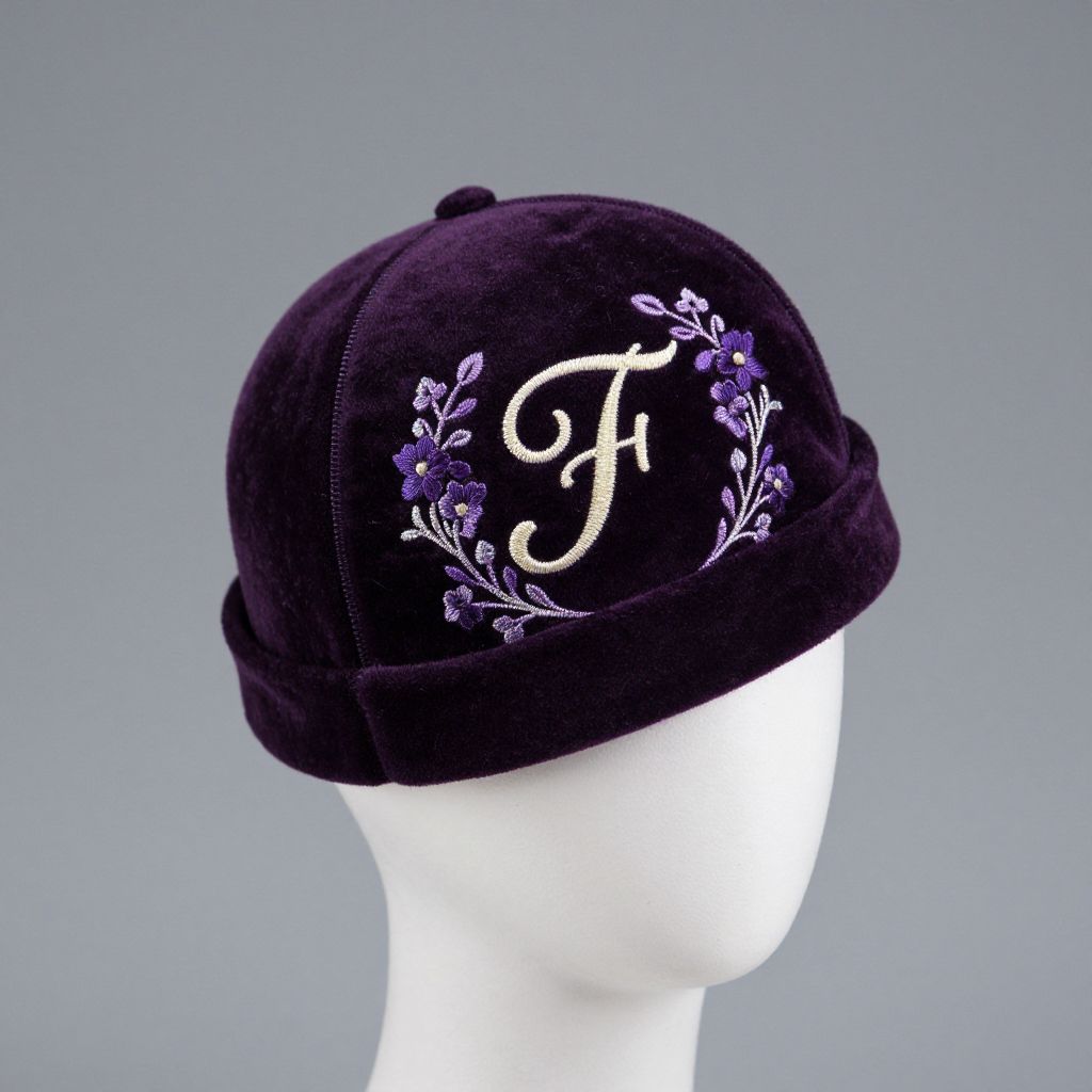 5cf78ae49 1800's Victorian Smoking Hat Cap Purple Velvet Embroidered Vintage Antique Initial Monogram Letter F Flowers Man's Woman's Size 23