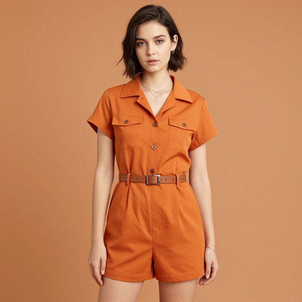 A stylish young woman with short dark hair poses confidently against a warm orange backdrop. She is dressed in a matching orange short-sleeve button-up romper with a brown belt, accessorized with delicate jewelry, showcasing a modern and polished fashion style.