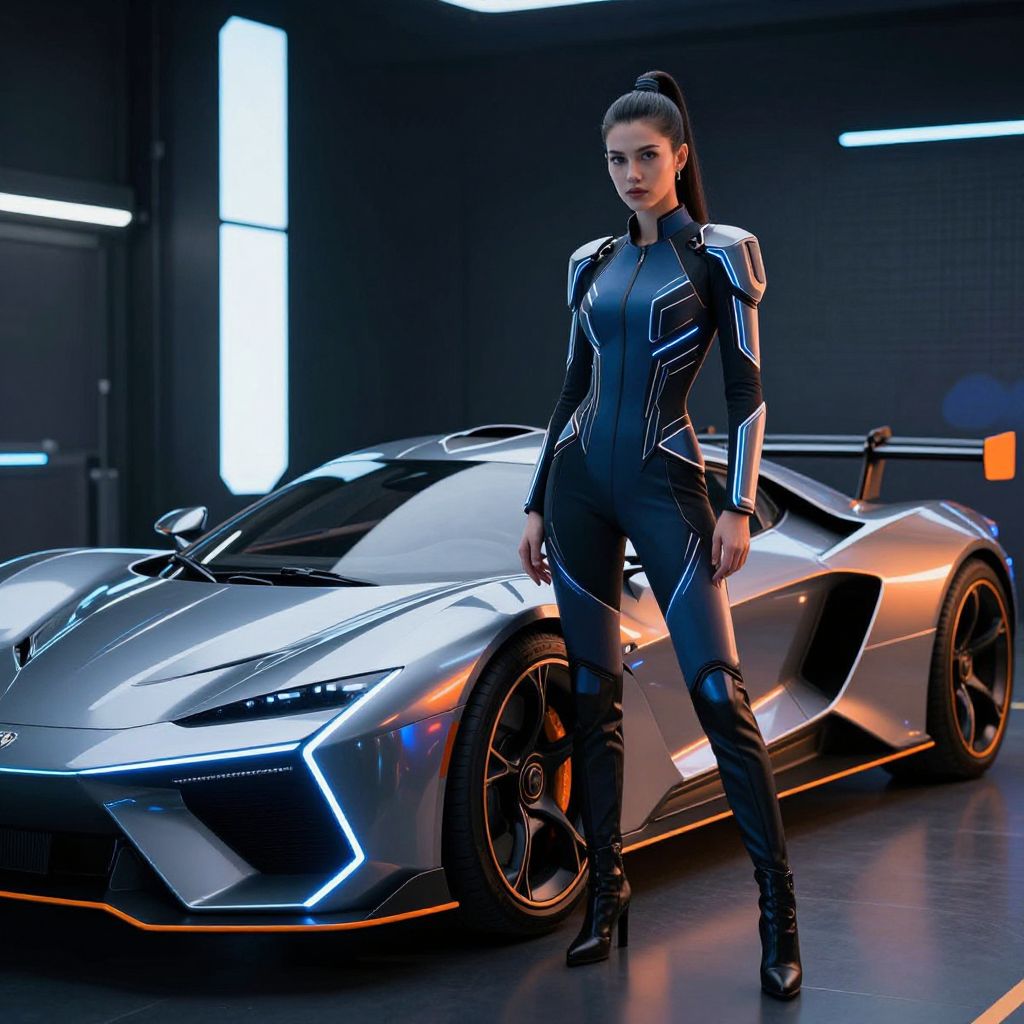 In this futuristic scene, a woman stands confidently beside a sleek, high-tech car, both exuding a sense of advanced technology and style. The car, with its futuristic design, features sharp lines and a glossy, metallic finish, illuminated by vibrant blue and orange lights that accentuate its modern aesthetic. The woman is dressed in a form-fitting, high-tech bodysuit adorned with intricate, geometric patterns that mirror the car's design. Her hair is styled in a sleek, high ponytail, adding to the overall futuristic look. The background is a dark, industrial setting with glowing vertical panels, creating a stark contrast that highlights the car and the woman, making them the focal points of the image. The composition is dynamic, with the car and the woman positioned in the foreground, drawing the viewer's attention immediately.