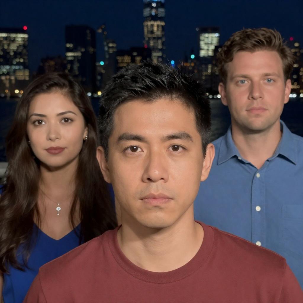 Photograph of three people in front of a city skyline at night. Foreground: close-up of a serious-looking man with short dark hair and a red shirt. Background: woman with long brown hair and blue top, man with light brown hair and blue shirt, both with neutral expressions. City lights illuminate the night sky.