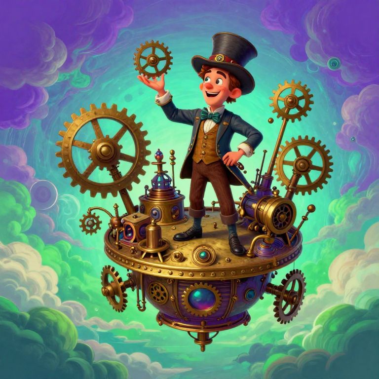 A whimsical steampunk-inspired illustration portrays an eccentric inventor standing atop a hovering brass platform, surrounded by an enchanting assortment of spinning gears, whirling turbines, and intricate machinery. From an aerial viewpoint, the scene captures his workshop suspended mid-air amidst a vivid sky filled with swirling clouds painted in rich hues of purple, turquoise, and emerald green. As the inventor enthusiastically showcases his latest creation, a playful grin graces his features, mirroring a blend of curiosity and eagerness for the wonders yet to be unveiled. The image radiates an atmosphere of wonderment and enchantment, seamlessly intertwining vintage charm with futuristic elements that evoke both nostalgia and awe.