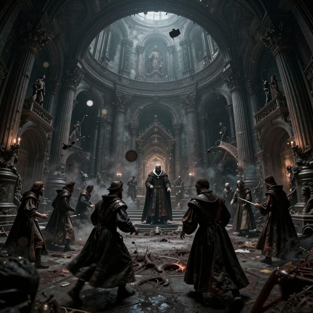 Digital art of a dark, smoky, gothic cathedral battle scene; cloaked figures wielding swords face off amidst debris and dim light.