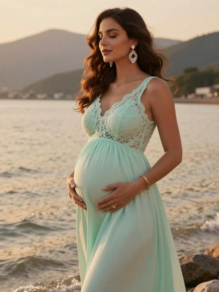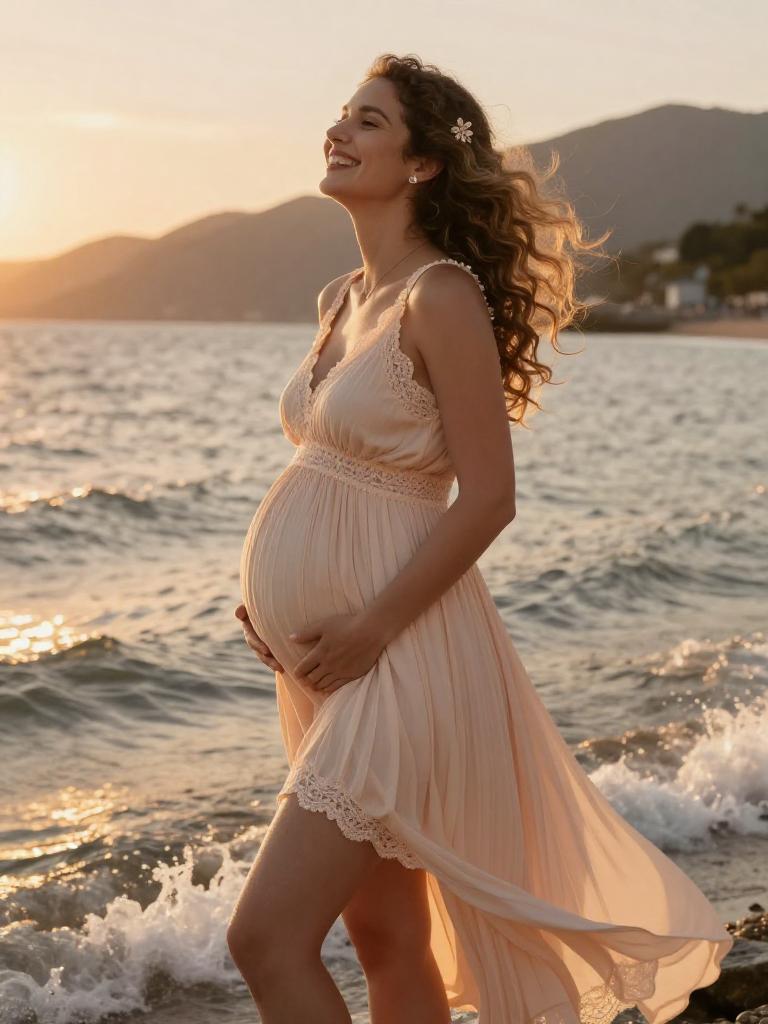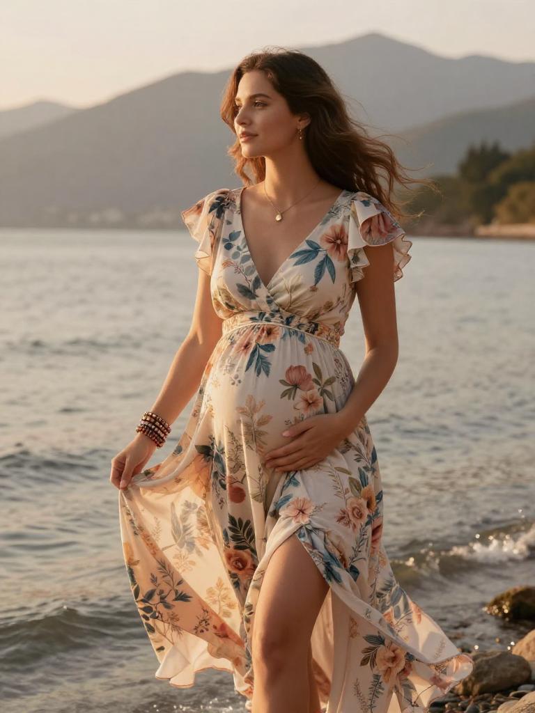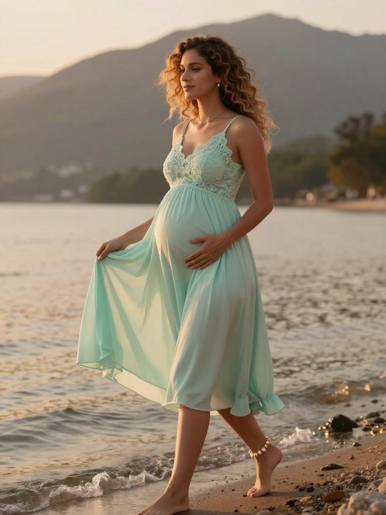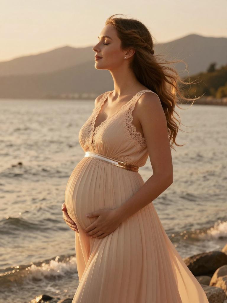 Pregnant fashion outfit, radiant expecting woman standing in the mountain during golden hour, wearing soft blush wrap maternity dress with ruffled hem with small hoop earrings and a soft chiffon scarf trailing in the breeze, loose dark curls to her shoulders hair gently moving in the breeze, posed standing in profile, hands resting on her bump, eyes closed in peaceful expression along the shoreline, soft warm sunlight illuminating her glowing skin and highlighting the fabric details, warm orange and yellow tones reflecting on the water, romantic and serene atmosphere, high-end maternity fashion photography, ultra-detailed