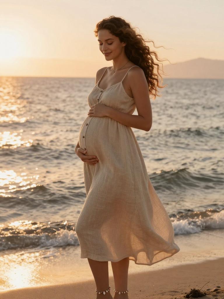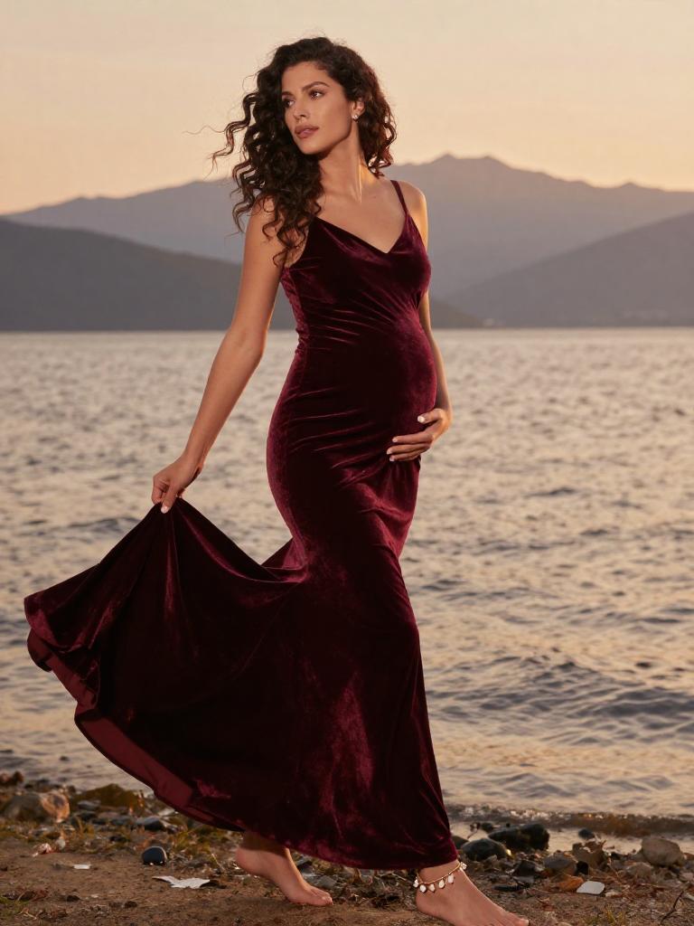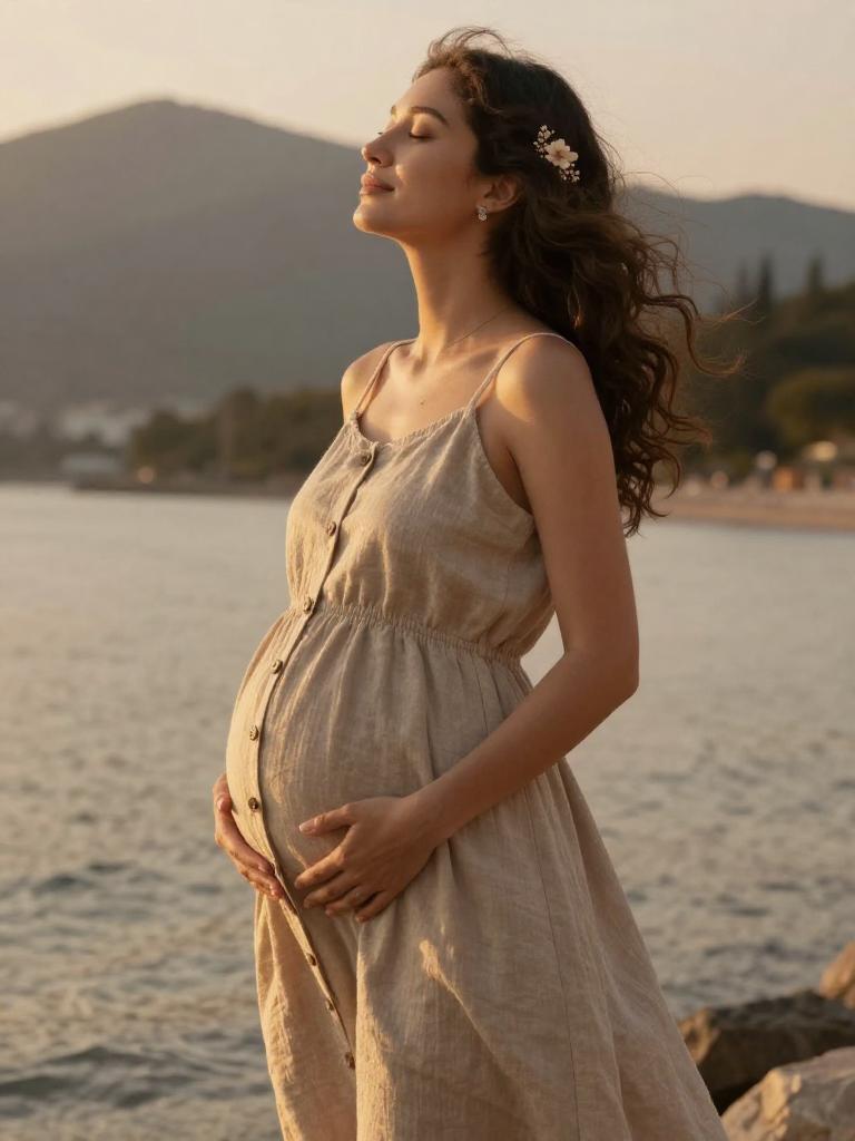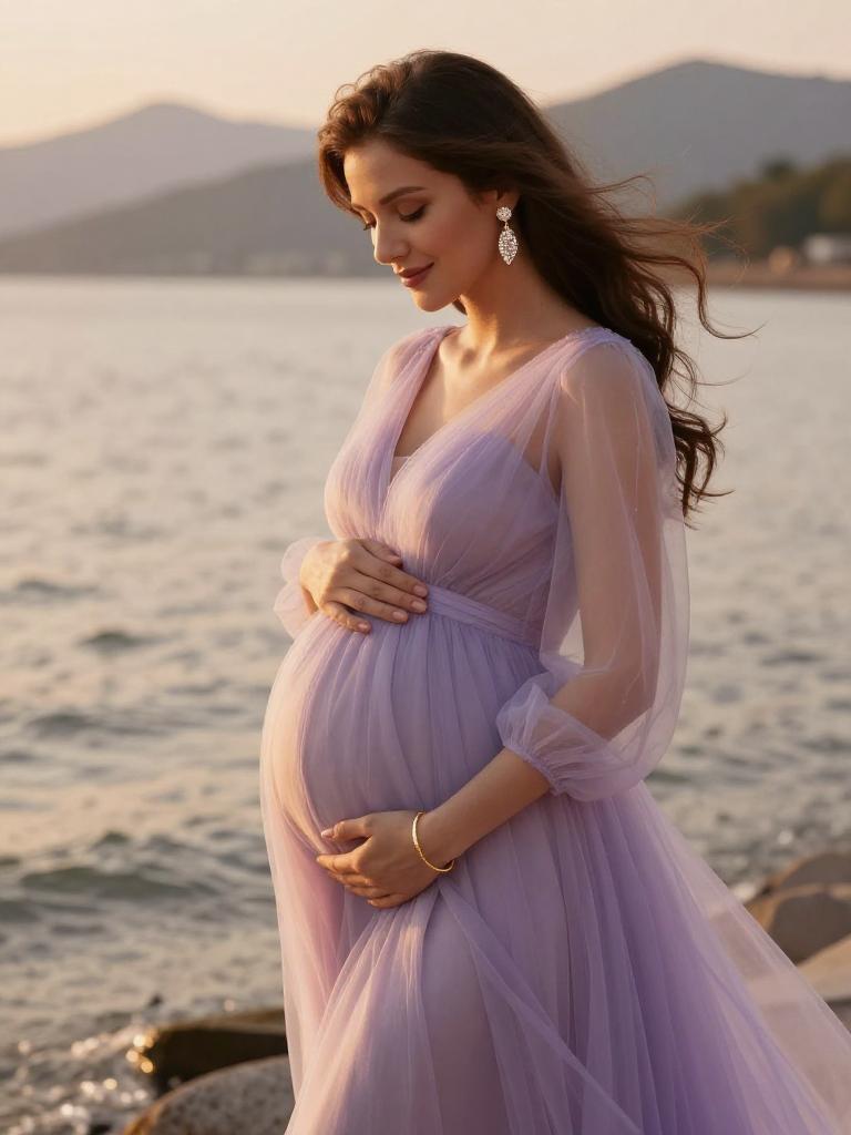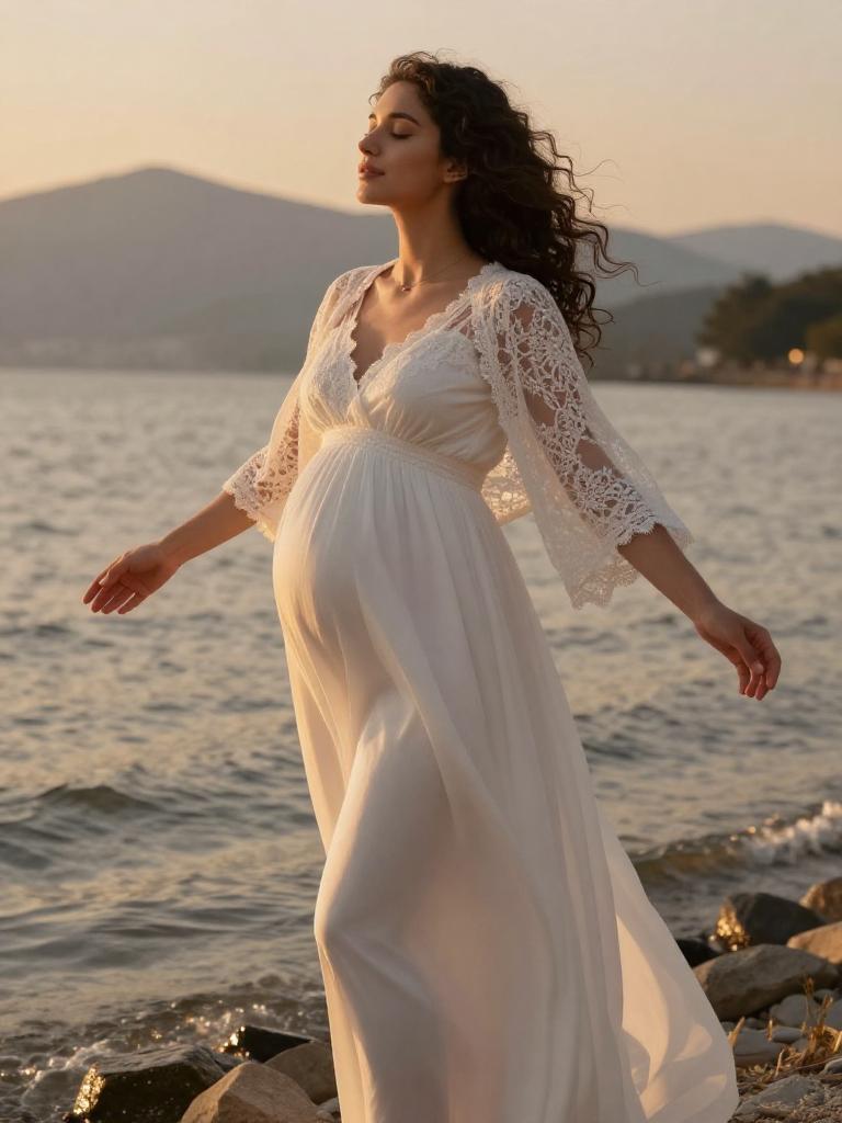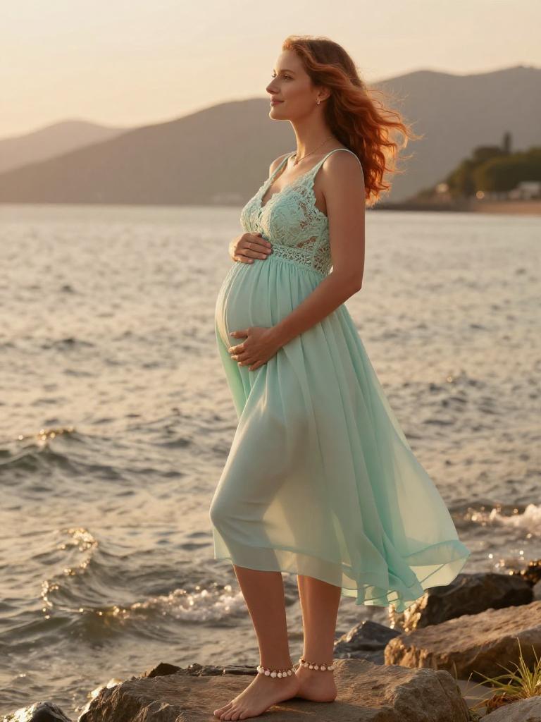 Pregnant fashion outfit, radiant expecting woman standing in the mountain during golden hour, wearing soft blush wrap maternity dress with ruffled hem with small hoop earrings and a soft chiffon scarf trailing in the breeze, loose dark curls to her shoulders hair gently moving in the breeze, posed standing in profile, hands resting on her bump, eyes closed in peaceful expression along the shoreline, soft warm sunlight illuminating her glowing skin and highlighting the fabric details, warm orange and yellow tones reflecting on the water, romantic and serene atmosphere, high-end maternity fashion photography, ultra-detailed