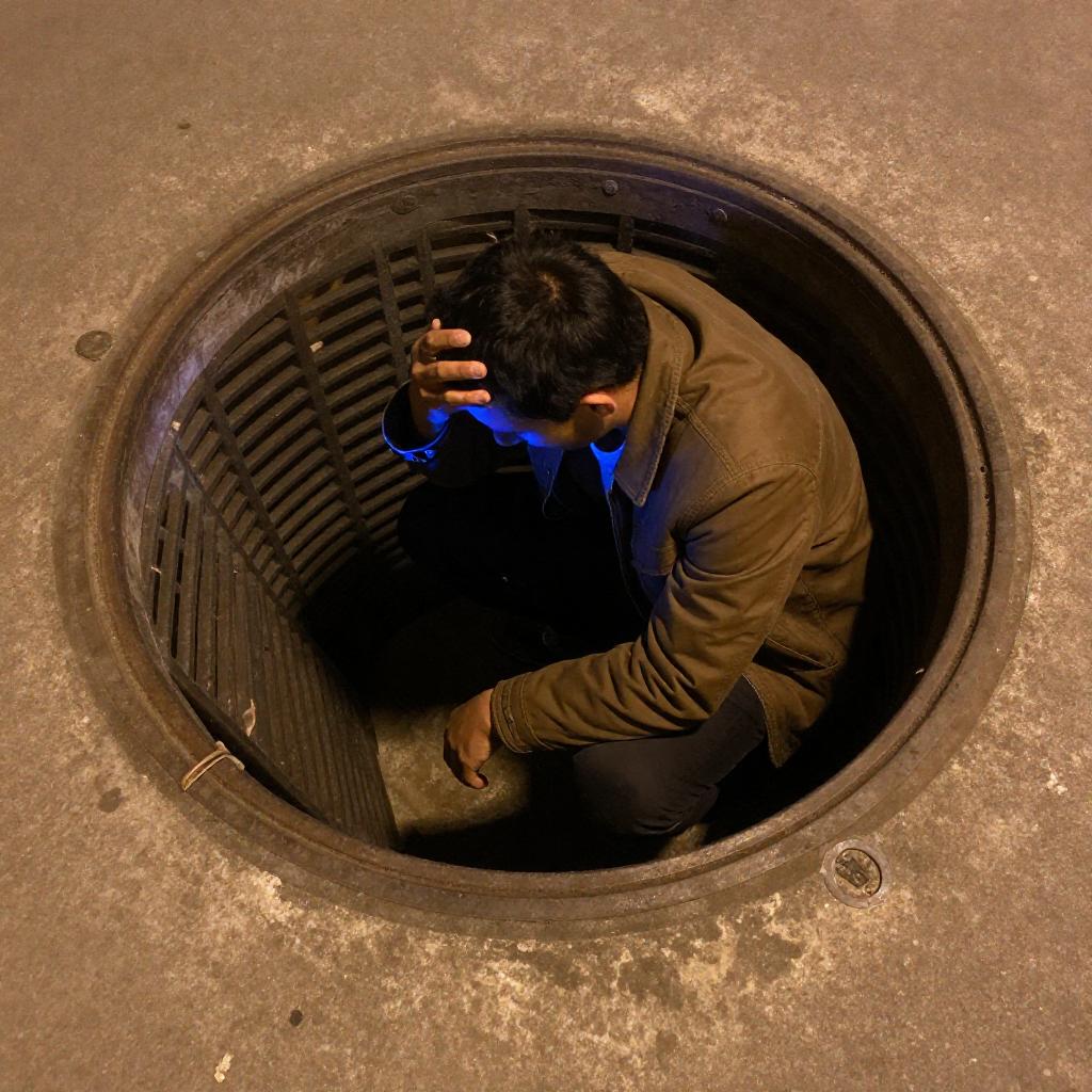 Photograph of a man with short dark hair, wearing a brown jacket, crouched in a dirty, circular storm drain at night. He holds his head with one hand, illuminated by a blue light. A metal grate is to his left. The concrete surrounding the drain is ured and worn.