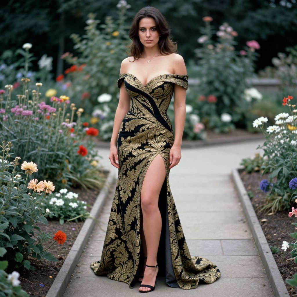A athletic woman in an elegant off-the-shoulder gown featuring a black and gold damask pattern, with a thigh-high slit and black stiletto sandals, stands gracefully in a flower garden with a stone pathway. The scene is captured in the visual style of 3M Ferrania analog film stock. Sexy. Pretty face and beаutiful eyes. Big breasts