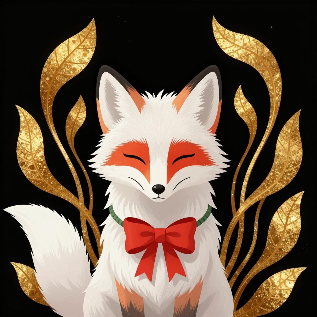 Illustration of a white fox with red facial markings, surrounded by multiple golden, leaf-like tendrils. Fox's eyes are closed, and it has a red bow with green rope tied around its midsection. Background is black with white speckles. Fox's fur is fluffy, and tendrils curve upwards and around it. Fox is centered, with tendrils framing its head and body.