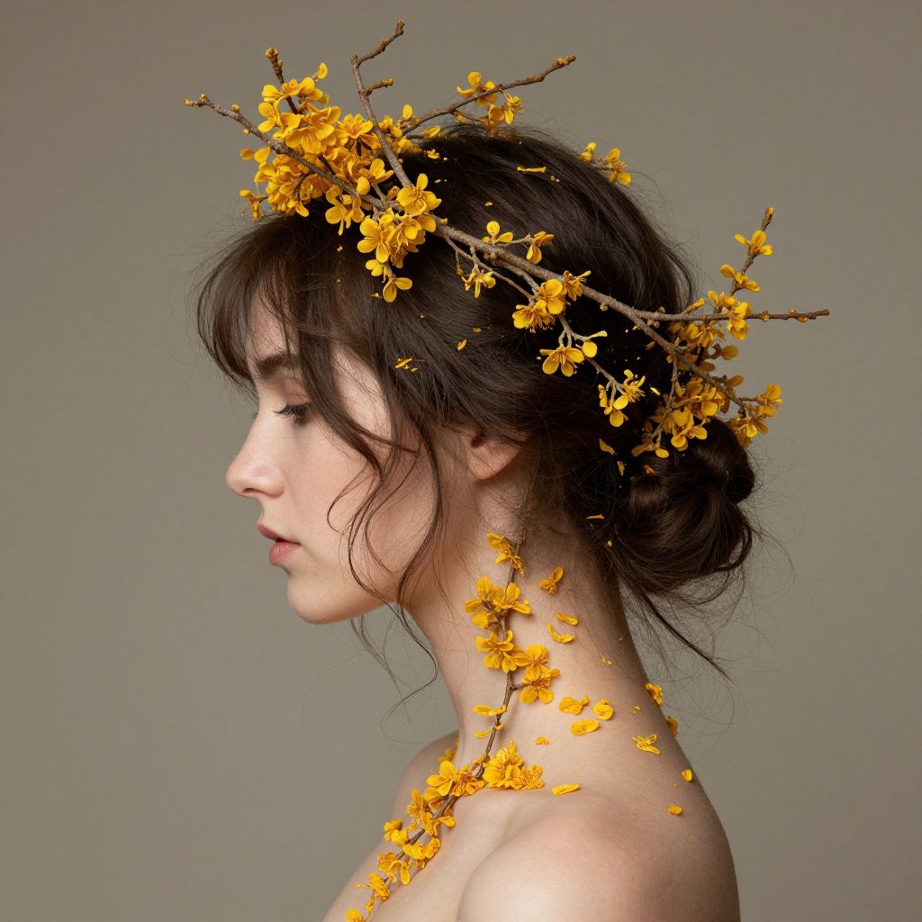 Golden blossoms cascade from a woman's head, intertwining with her dark hair and extending down her neck, as delicate petals and slender branches form a natural crown against a muted backdrop.