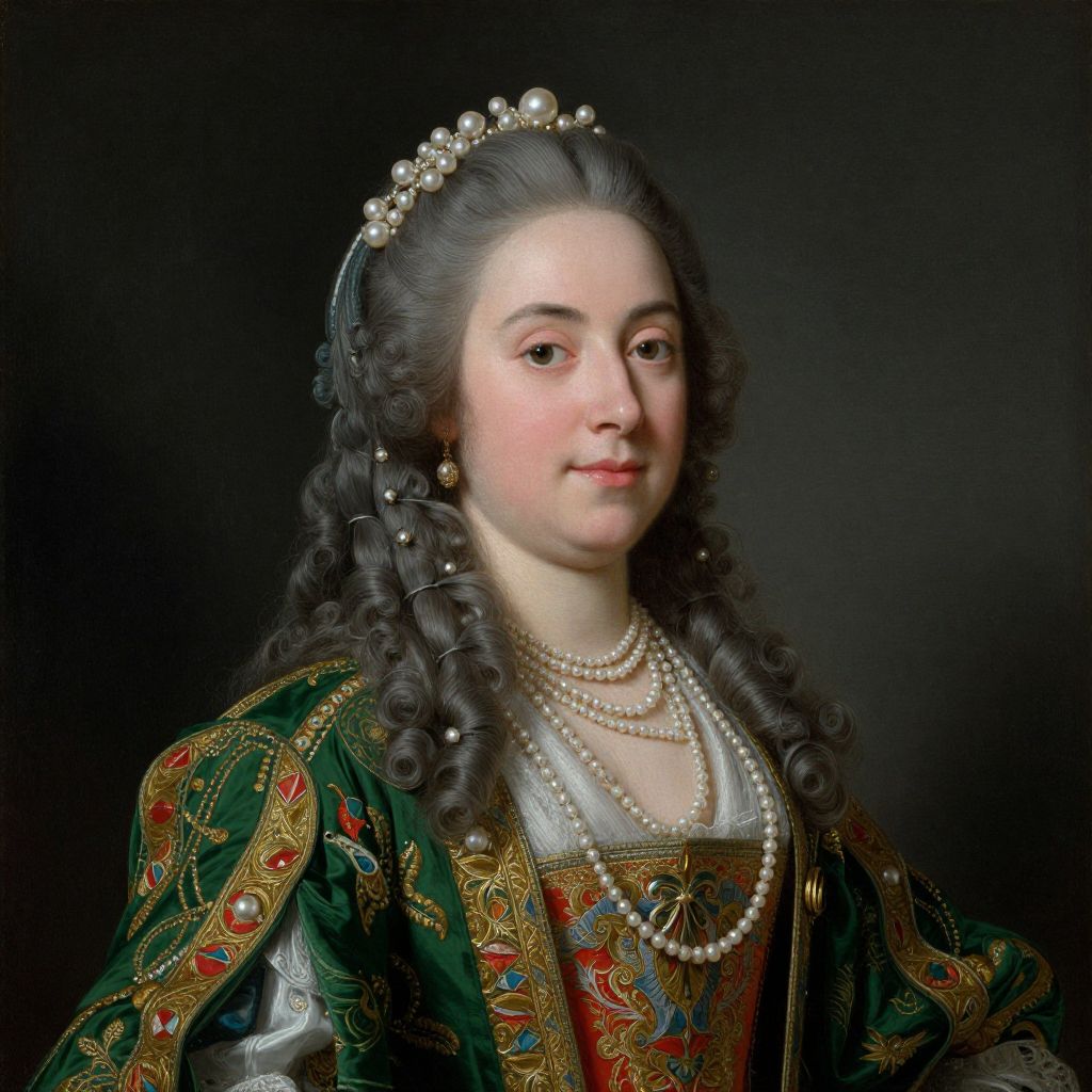 Portrait of a woman, possibly Madame Claude Lambert de Thorigny (Marie Marguerite Bontemps), painted by Nicolas de Largillière in 1696, featuring intricate details such as her styled gray hair adorned with pearl ornaments, layered pearl necklaces, and a green garment with ornate gold and red embroidery, set against a dark background.