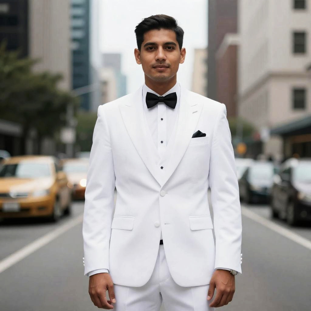 Photograph of a young South Asian man with short, dark hair, standing in the center of a city street. He wears a crisp, white tuxedo with a black bow tie and black pocket square. His expression is neutral, and he stands confidently with his hands by his sides. The background features blurred city buildings and a yellow taxi on the left. The street is lined with cars and trees, creating an urban setting. The photograph has a sharp focus on the man, with a shallow depth of field blurring the background.