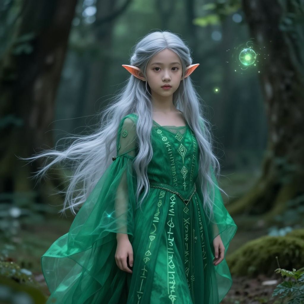 Young elf girl standing in an enchanted forest, delicate pointed ears, long flowing silver hair, wearing a flowing emerald green dress adorned with ancient runes, soft glowing magical orbs surrounding her, ethereal and mystical atmosphere, detailed fantasy art style.