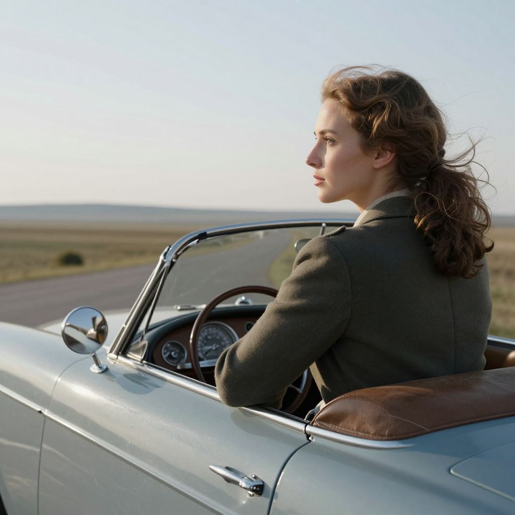 Photograph of a young woman with wavy brown hair, wearing a black off-shoulder top, sitting in the driver's seat of a silver convertible car on a deserted road during sunset. She gazes to the right with a serene expression. The car's sleek, chrome-trimmed exterior contrasts with the soft, golden light of the setting sun. The background features a vast, open field stretching to the horizon under a pale blue sky. Her left hand rests on the car's door, and the road is lined with faint white markings. The image exudes a sense of freedom and tranquility.