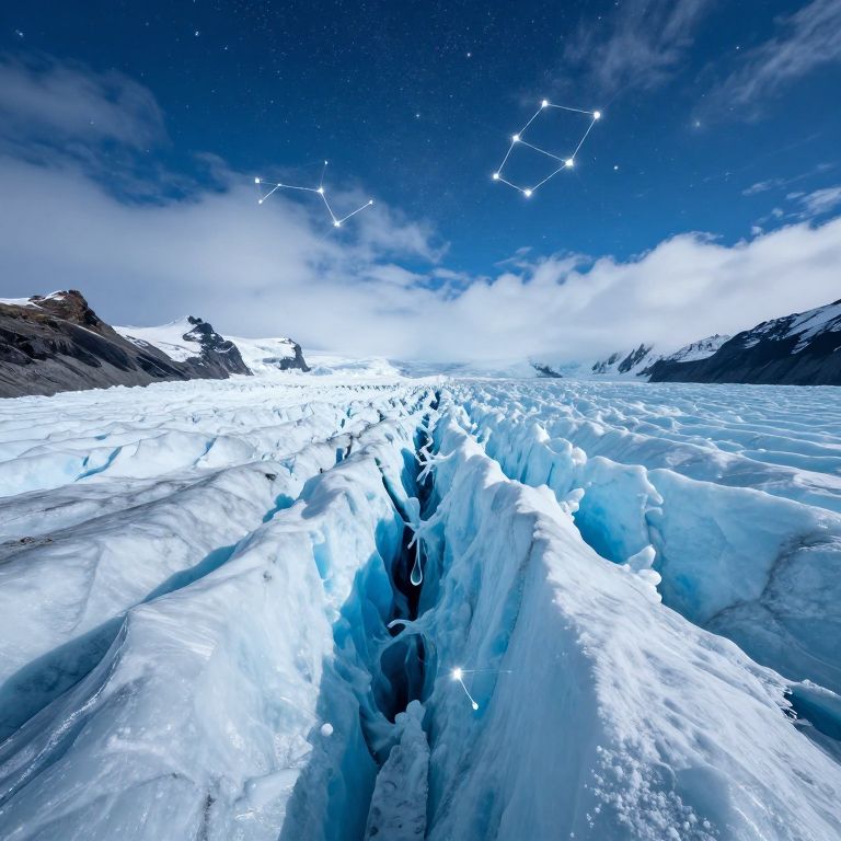 Photograph of a glowing, icy glacier under a starry, deep blue night sky with constellation outlines, surrounded by snow-covered mountains.