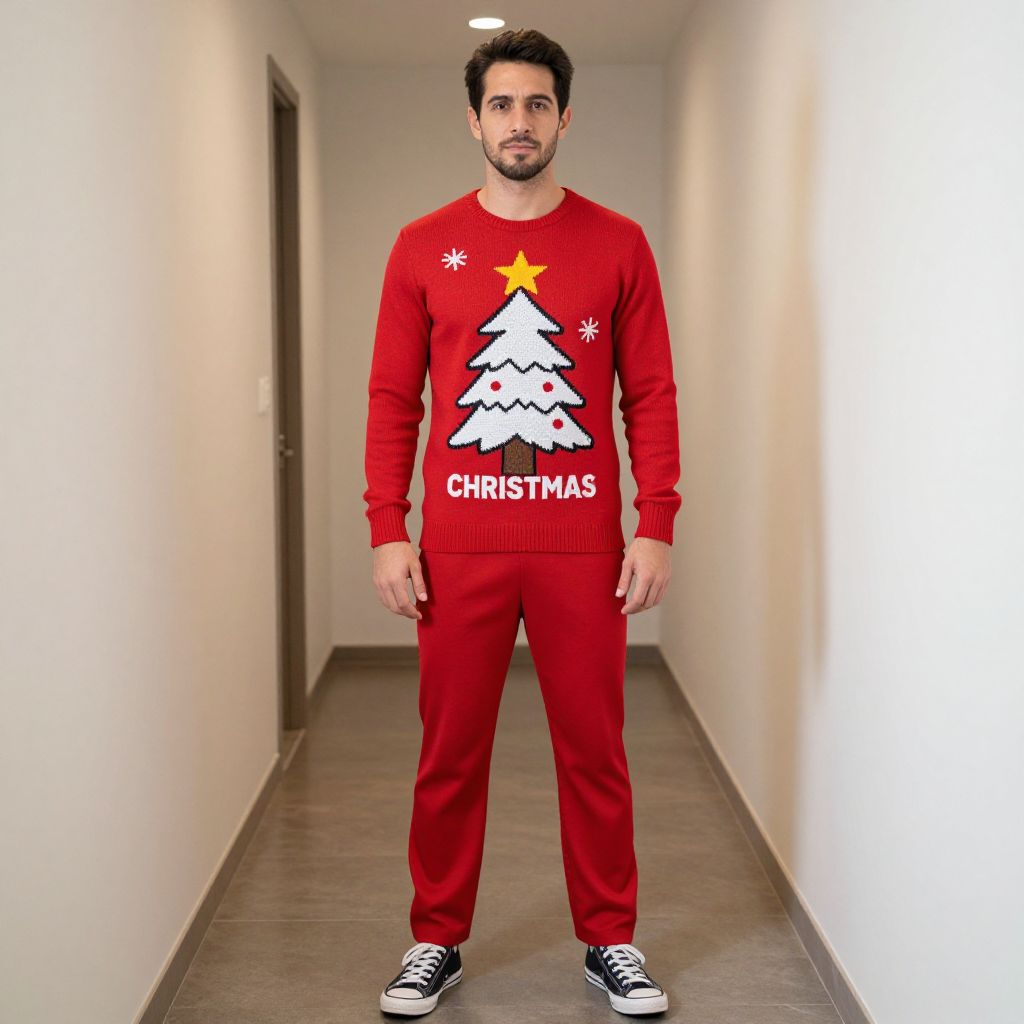 Photograph of a young man standing in a narrow, white-walled hallway with concrete floors. He has short dark hair, a trimmed beard, and a neutral expression. He wears a red Christmas-themed sweater with a white Christmas tree adorned with red ornaments and a yellow star on the chest, and the word "CHRISTMAS" below the tree. He pairs the sweater with red pants and black-and-white sneakers. The hallway has a single door on the left. The image has a slightly overexposed, surreal quality, with a humorous, cartoonish feel.